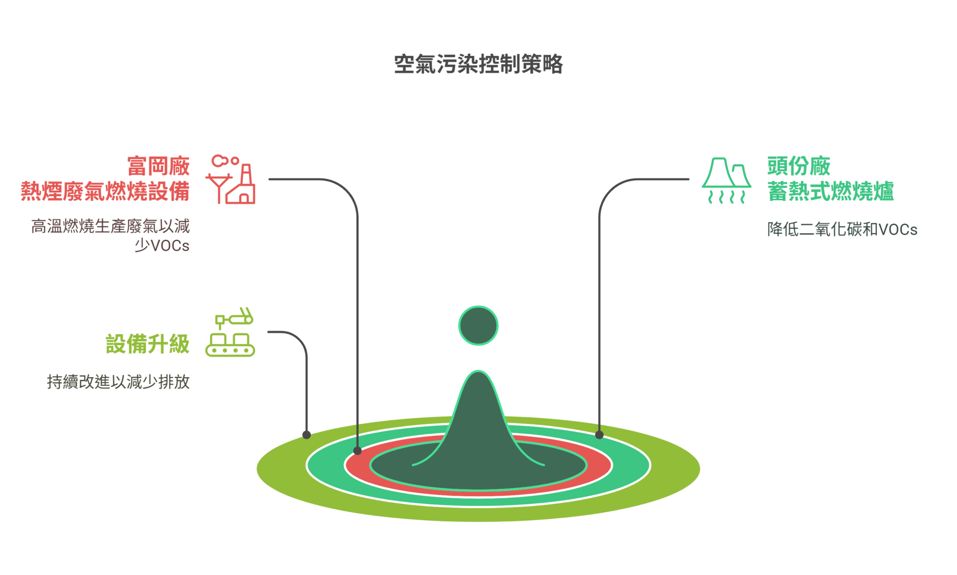 為達成污染防治和法規遵循目標,本公司在富岡廠區設有熱煙廢氣燃燒設備,將生產廢氣高溫燃燒,有效地減少揮發性有機物排放量。此外,燃燒塔將部分廢氣導回進行二次燃燒,作為替代燃料以降低燃料使用。頭份廠區則配備了蓄熱式燃燒爐與匯流管等空污防治設備。蓄熱式燃燒爐的設計可以節省能源消耗並降低二氧化碳排放,廢氣經匯流管收集後,再以高溫燃燒方式,其VOCs的削減率可達98%。